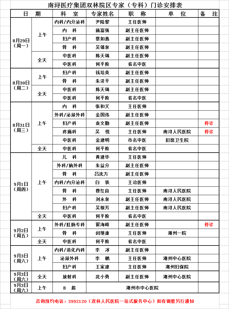 雙林院區(qū)專家排班2022-8-29/2022-9-3