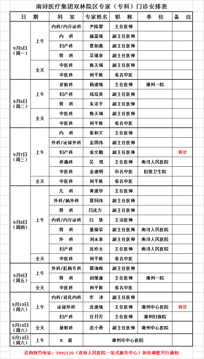 雙林院區(qū)專家排班2022-9-5/2022-9-10