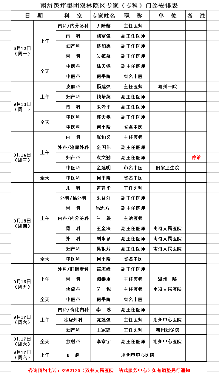 雙林院區(qū)專家排班2022-9-12/2022-9-17