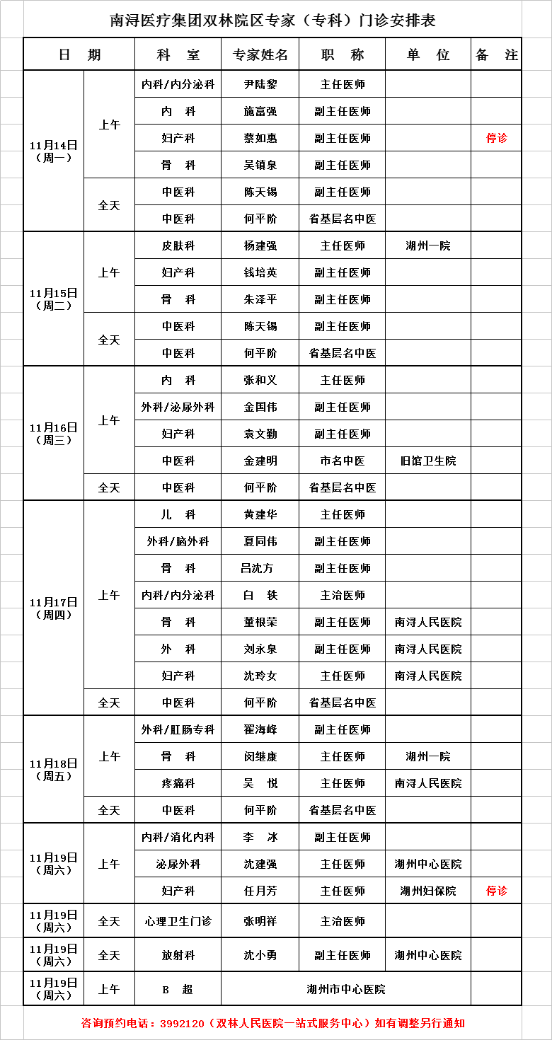 雙林院區(qū)專家排班2022-11-14-2022-11-19