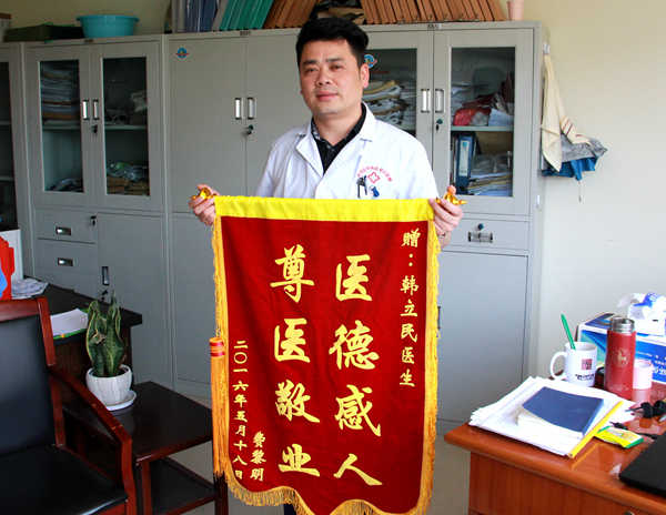 據(jù)了解,這面錦旗的到來,是因為5月15日外科門診來了一位由家屬攙扶的八十歲左右的費大爺,一直捂著肚子,面露痛苦樣。那天外科副主任醫(yī)師韓立民正巧門診,通過詢問了解到費大爺肚子脹痛,已經(jīng)好幾天未解大便了,通過檢查費大爺下腹有存糞的腸襻,肛診有糞塊?! ?br /> 韓醫(yī)生戴上手套,在診療間為費大爺進行了通便處理,頓時在診療見散發(fā)出一股惡臭味,帶著口罩也無法抵擋住氣味,但是韓醫(yī)生一直處理到費大爺結(jié)束,無怨無悔,為了減輕費大爺?shù)牟⊥?,這是一份責(zé)任!